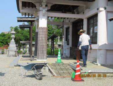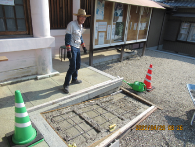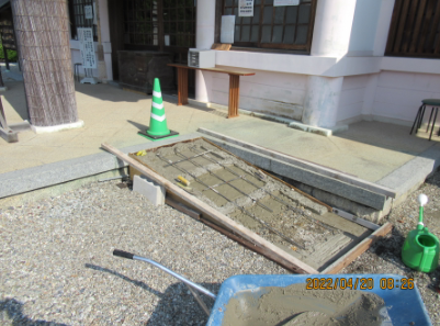 スロープ建設中 拝殿前にスロープを建設しています。 今年のお正月も車いすの方が3組お越しになりました。 神社の役員がその都度車いすを運んでくれていたと聞きました。 此処ともう1か所スロープをつければ車いすを押して上がれる様になります。 基礎を作り、鉄筋を入れ、コンクリートを流し込んでいきます。完成すれば多くの障害のある方が安心して参拝出来るようになるでしょう。 設計・施工は地元の高濱工務店です。 寡黙に、順序良く工程をクリアしていきます。